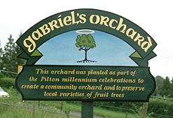 Gabriel’s Orchard at Pilton in Somerset (both pictures, above) is a new orchard in a rural area where orchards emcompass much cultural and social history. In 1996 the first discussions were held to consider what might be suitable projects for Pilton’s Millennium celebrations. Village resident Joe King tells more: