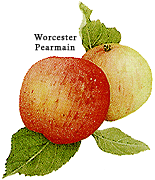 Worcester Pearmain a popular variety thought to have originated at Swan Pool near Worcester in about 1870, raised by Mr Hale from a pip taken from a Devonshire Quarrenden and introduced by Messrs Smith of Worcester in 1873. Very sweet and juicy, crisp, attractive fruit with a red skin and white flesh, with a hint of strawberry, a good apple for sorbets.