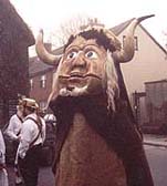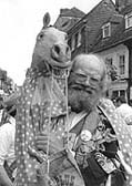 Hooden Horses are particular to east Kent. A carved horse head with a noisy articulated lower jaw is affixed to a pole hung with hessian which hides the performer. He is accompanied by a carter, a rider and a betsy (man as woman) who join him in a short play performed for money before Christmas a time when work was short. After virtually dying out Hoodening made a resurgence in the 1950s and a new white horse Invicta (after Kent's emblem) appeared and has joined with the East Kent Morris Men. More Hooden Horses have appeared and in 1998 three appeared together in one play. Look out for them between Whitstable and Folkestone (the museum there has a Horse head from Walmer. A book of excellent photographs taken by Percy Maylem exists from 1909). Read more about Hoodening on-line.