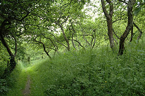 Penhill Community Orchard (left), Westbury Road, Penhill, Swindon (Grid ref: SU148880. From Penhill Drive take the 3rd left opposite the shops and by the Deer’s Leap pub to Inglesham Road. Take the 2nd left (Westbury Road) which turns into a dust road before reaching the orchard. There is no parking). An orchard of 1.7 acres near Penhill housing estate and adjacent to Seven Fields Nature Reserve, Seven Fields School and Penhill Playing Fields. The land was previously unused allotments and is owned by Swindon Borough Council who had wanted to develop the land for housing, a threat that remains. Penhill Orchard Group, an independent community group, formed to start the orchard. They have a seven year lease from 2002 and hope that it will be renewed in 2009. The first trees were planted at Wassailing in the winter of 2002/3 with more planted in the following years. There are around forty-five apple varieties, four plum, five pear, three cherry and a mulberry chosen to give a long fruiting season. The rootstocks vary and include standards. A margin of grass is left along the fence-lines, a bird berry border is being planted and bug boxes installed. Wild life sightings are recorded. The orchard is surrounded by tall trees on three sides in the school grounds and nature reserve. Deer reach the orchard through wild life corridors. There are slowworms, badgers and many insects and birds. Ragwort attracts cinnabar moths. There are two locks-ups for storage and a canteen, with keys held by group members. There is full access to the orchard at all times. Further wassailing is planned, plus family picnics in the orchard. When the harvest is larger Apple Day will be celebrated. Contact: Marilyn Beale, 31 Avebury Road, Penhill, Swindon SN2 5JR, +44(0)1793 331516, penhill.orchard[at]ntlworld.com